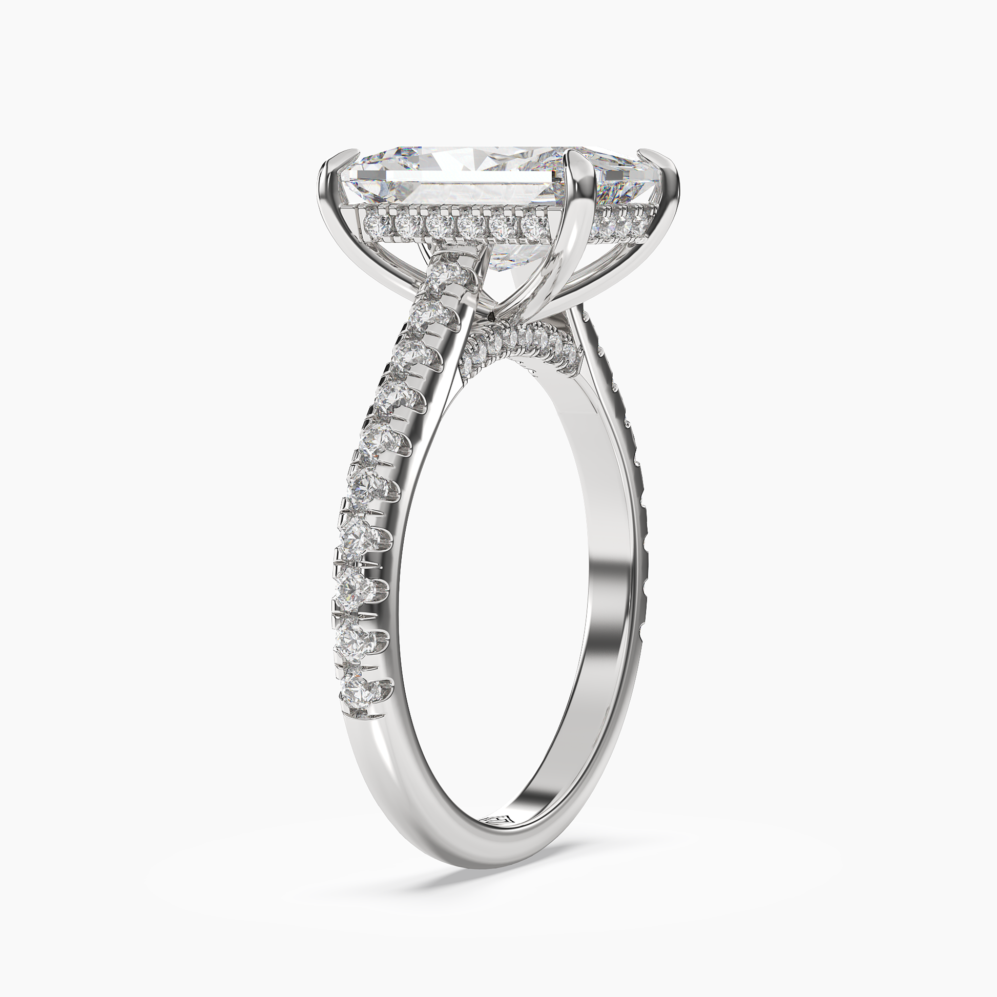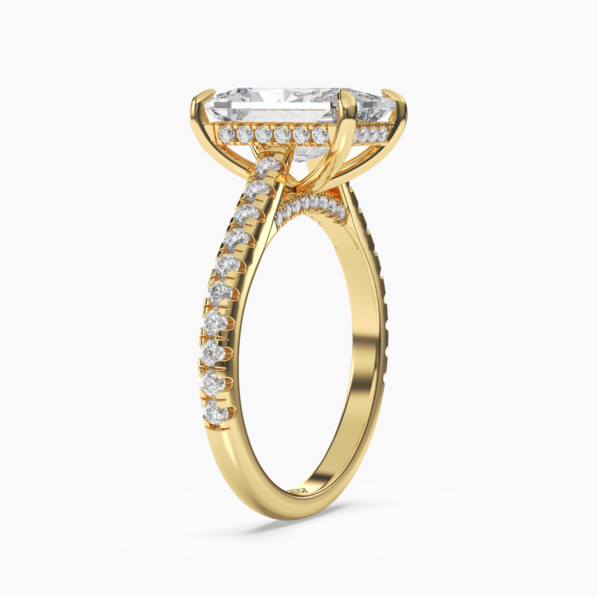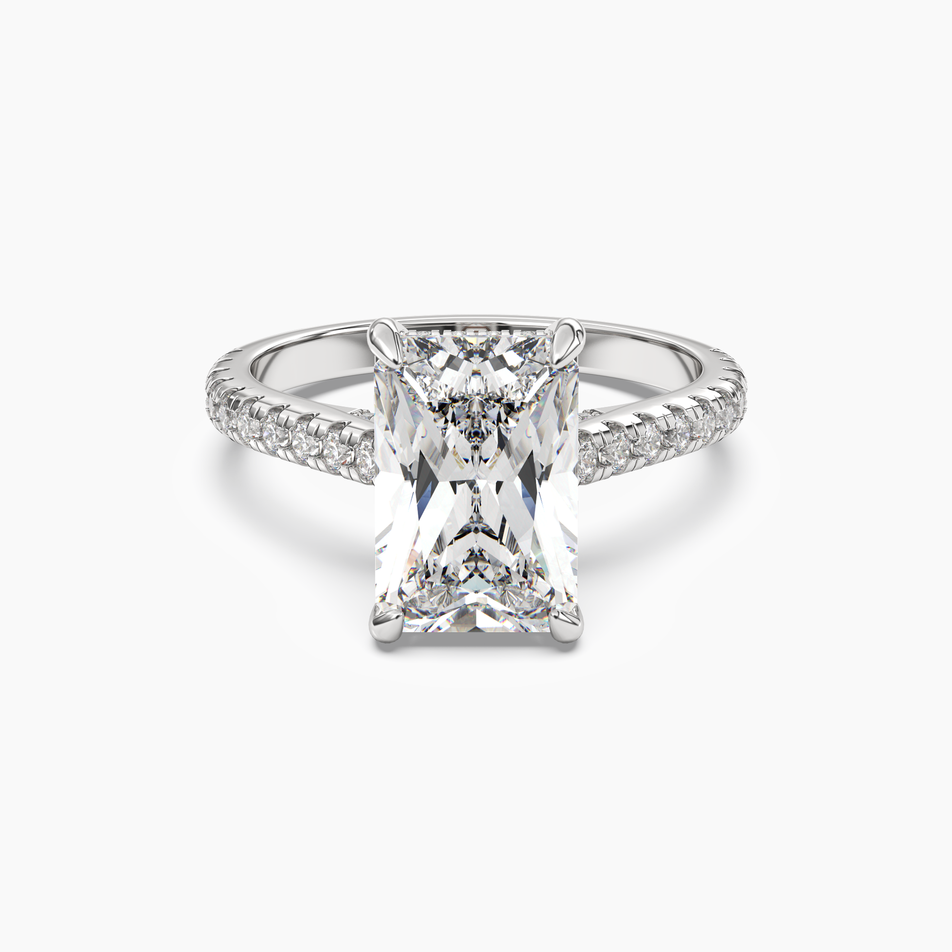 A captivating ring featuring a brilliant radiant-shaped center stone, set atop a diamond-encrusted band with a graceful under-gallery of pavé accents.