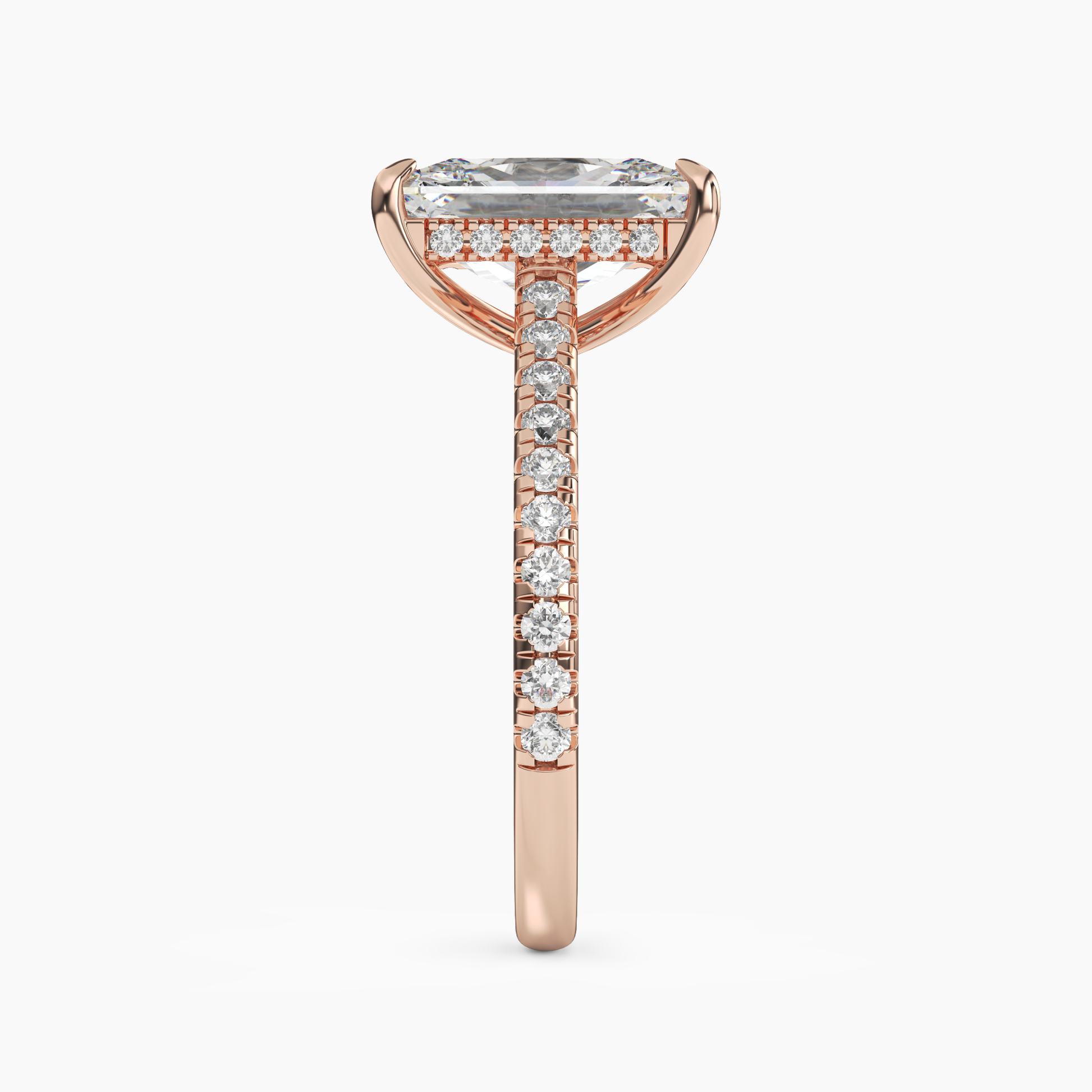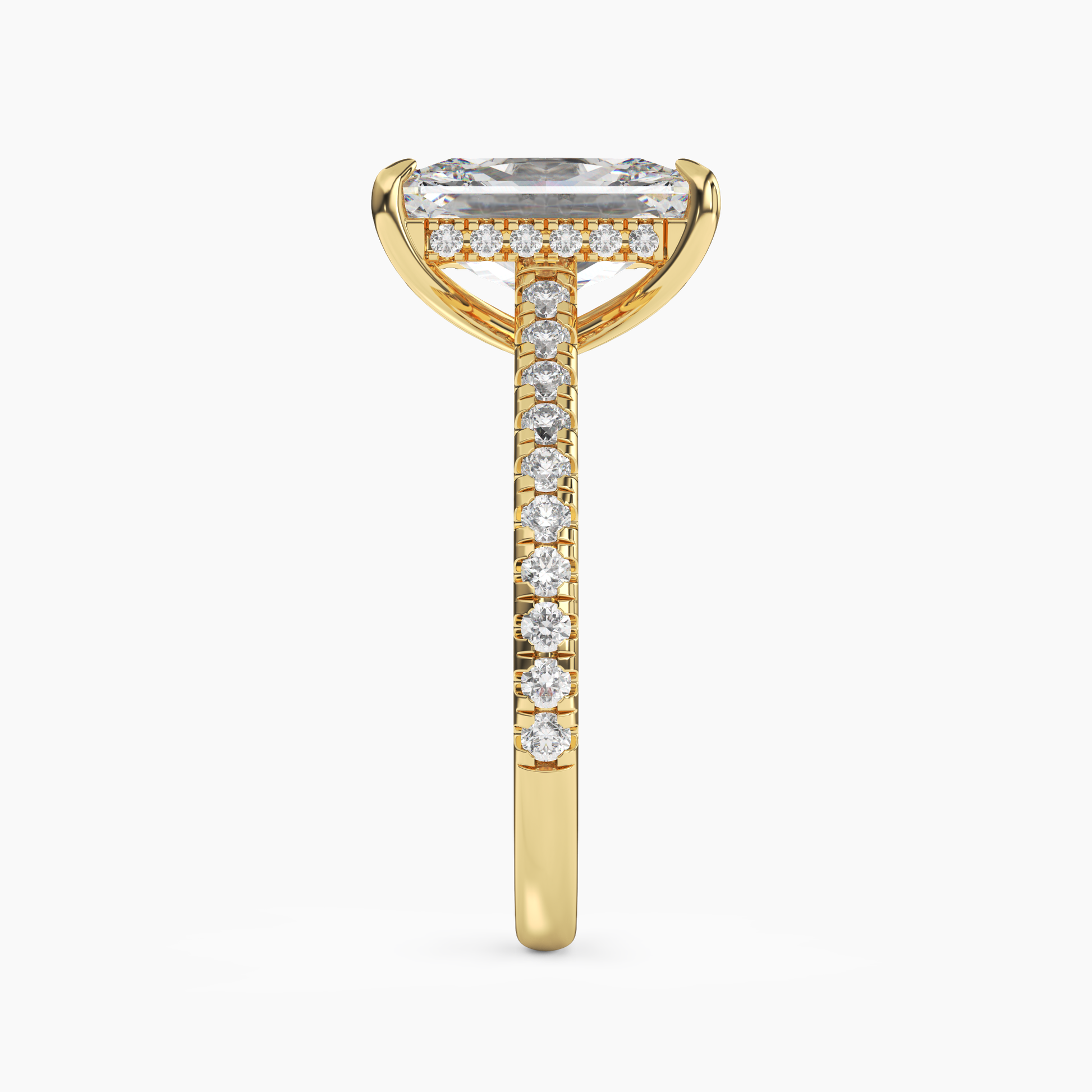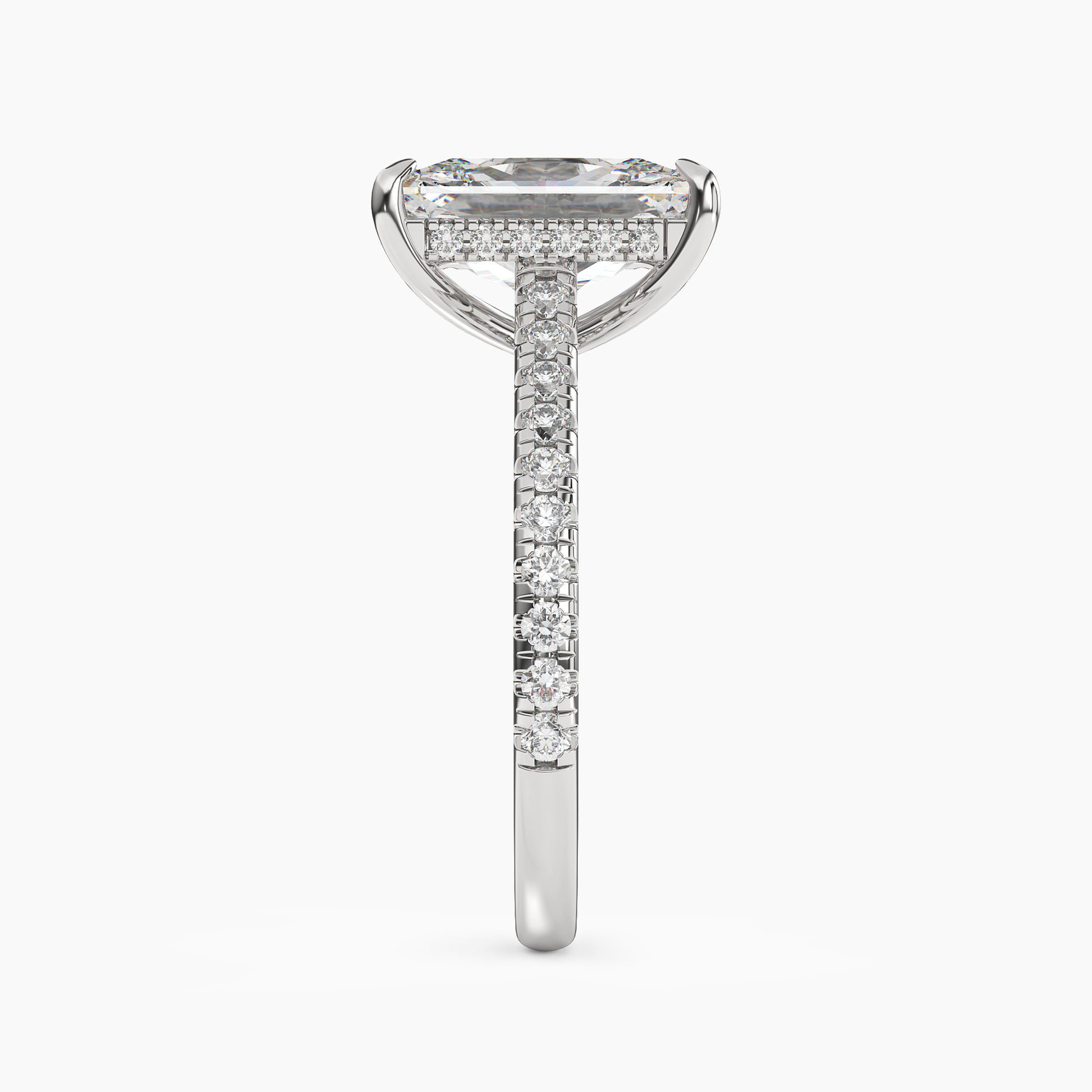 A captivating ring featuring a brilliant radiant-shaped center stone, set atop a diamond-encrusted band with a graceful under-gallery of pavé accents.
