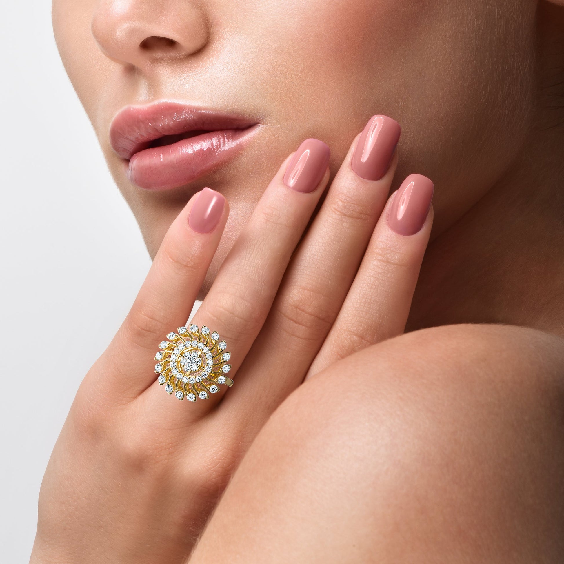 The Solis Round Lab-Grown Diamond Ring features a stunning central round diamond, beautifully surrounded by a cluster of smaller diamonds. Available in various gold options, this ring offers a perfect blend of elegance and sustainability. The dazzling arrangement of diamonds enhances the brilliance of the central stone, making it a timeless and eco-conscious choice for those who appreciate both luxury and ethical craftsmanship in their jewelry.