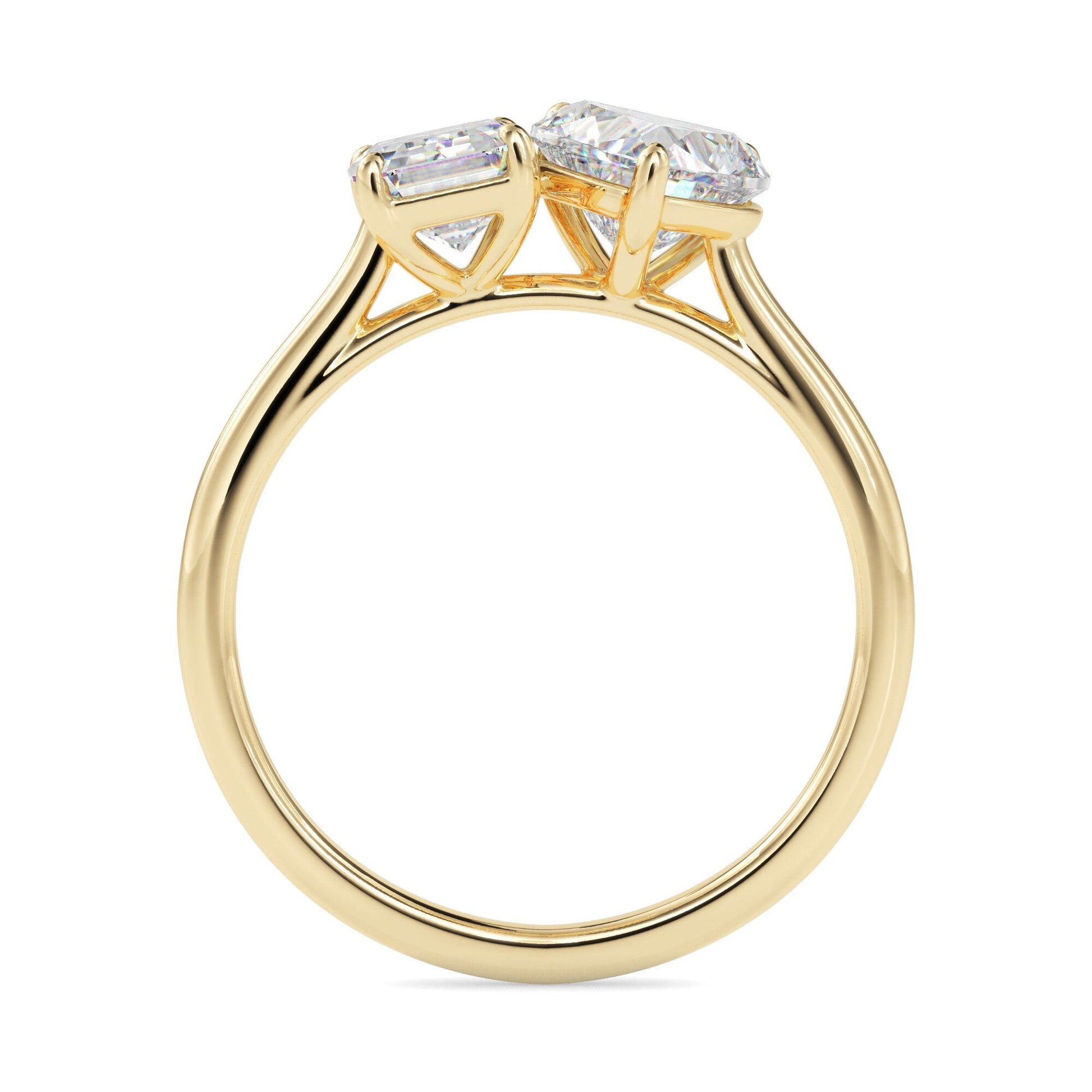 The Kylie Ring, also known as the Toi et Moi Ring French for “you and me” is a captivating symbol of unity and love. This elegant design features two stunning stones: a classic emerald diamond and a graceful heart shaped diamond, set side by side. Accented with dazzling diamonds of various carats, the ring sparkles beautifully in the light, creating a timeless and romantic statement.