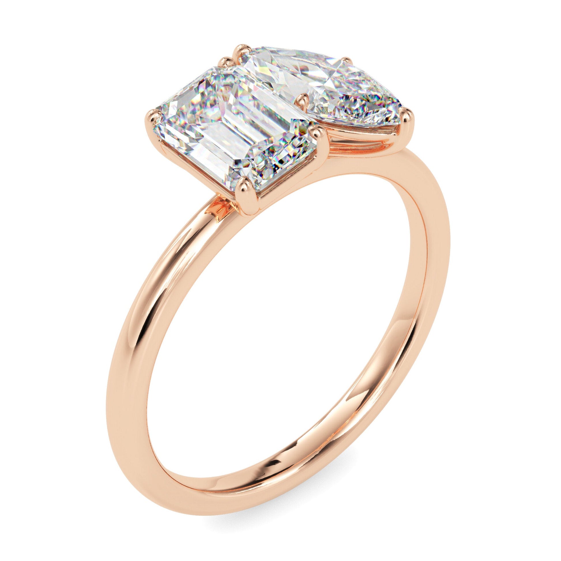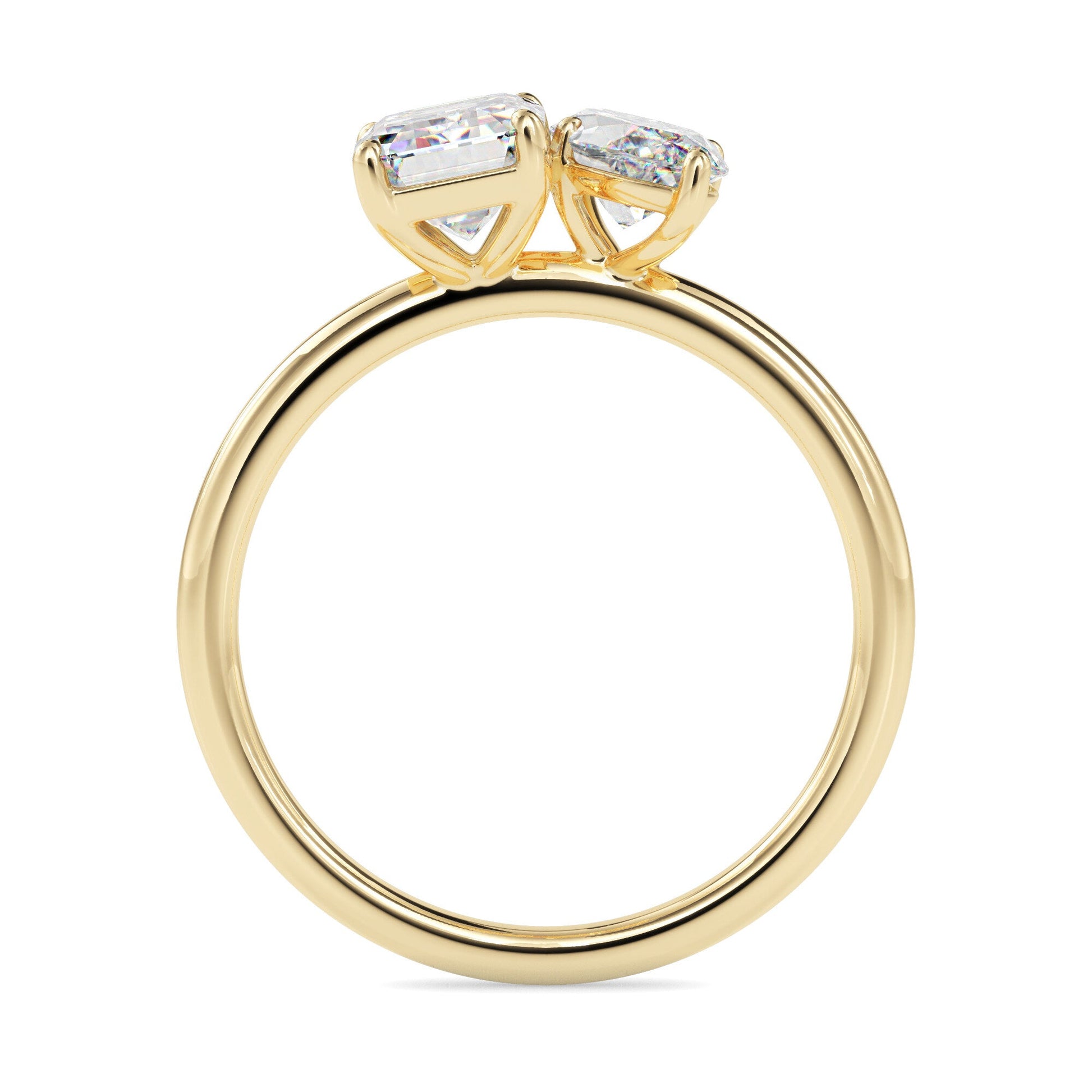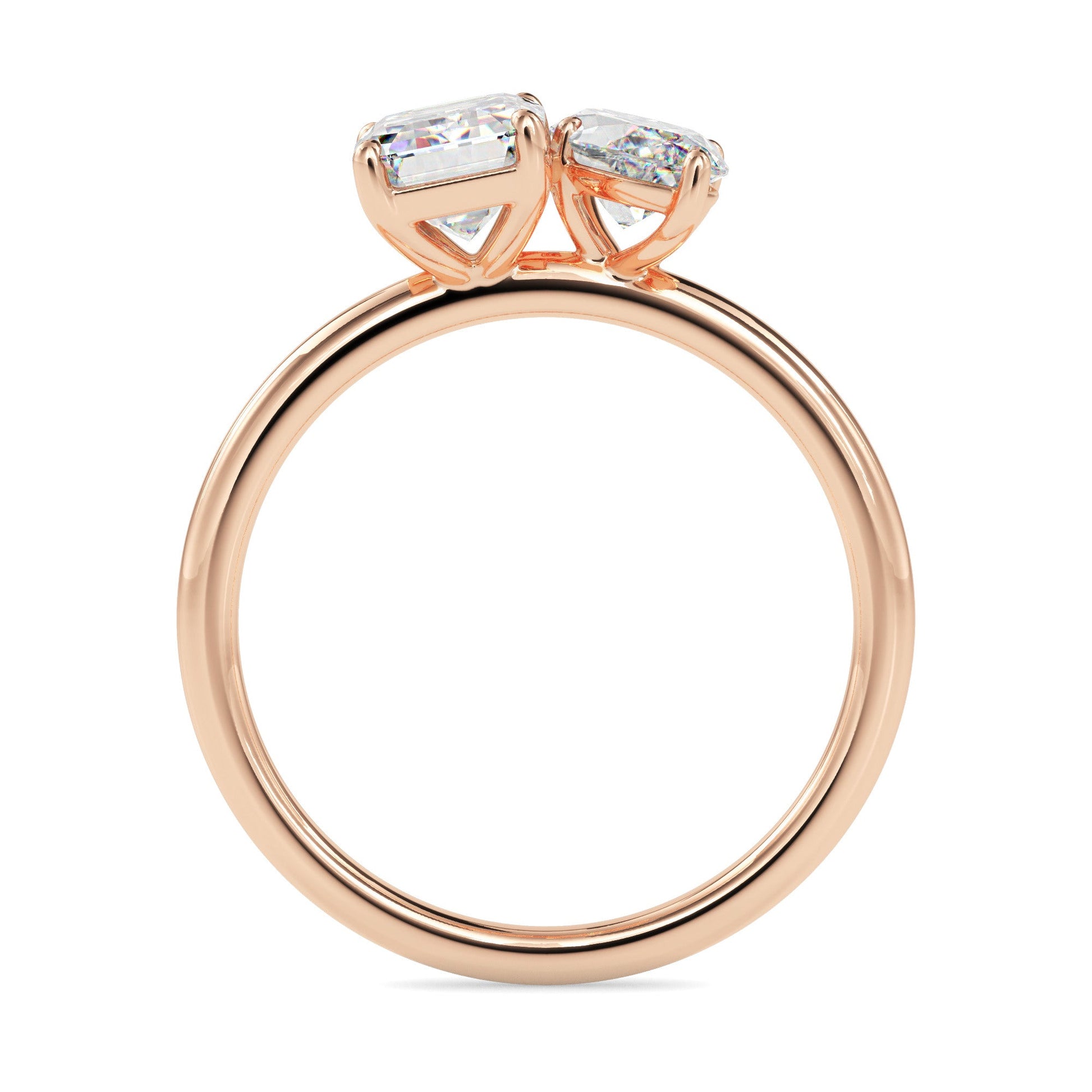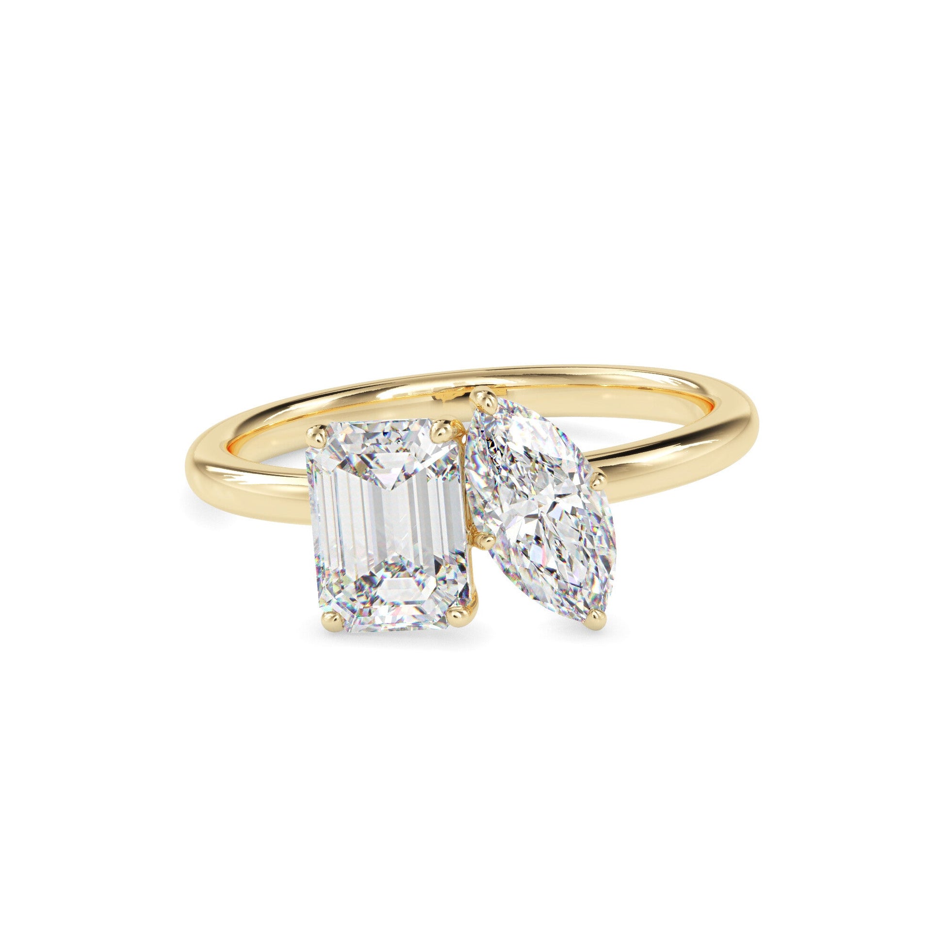 The Kylie Ring, also known as the Toi et Moi Ring French for “you and me” is a captivating symbol of unity and love. This elegant design features two stunning stones: a classic emerald diamond and a graceful marquise shaped diamond, set side by side. Accented with dazzling diamonds of various carats, the ring sparkles beautifully in the light, creating a timeless and romantic statement.
