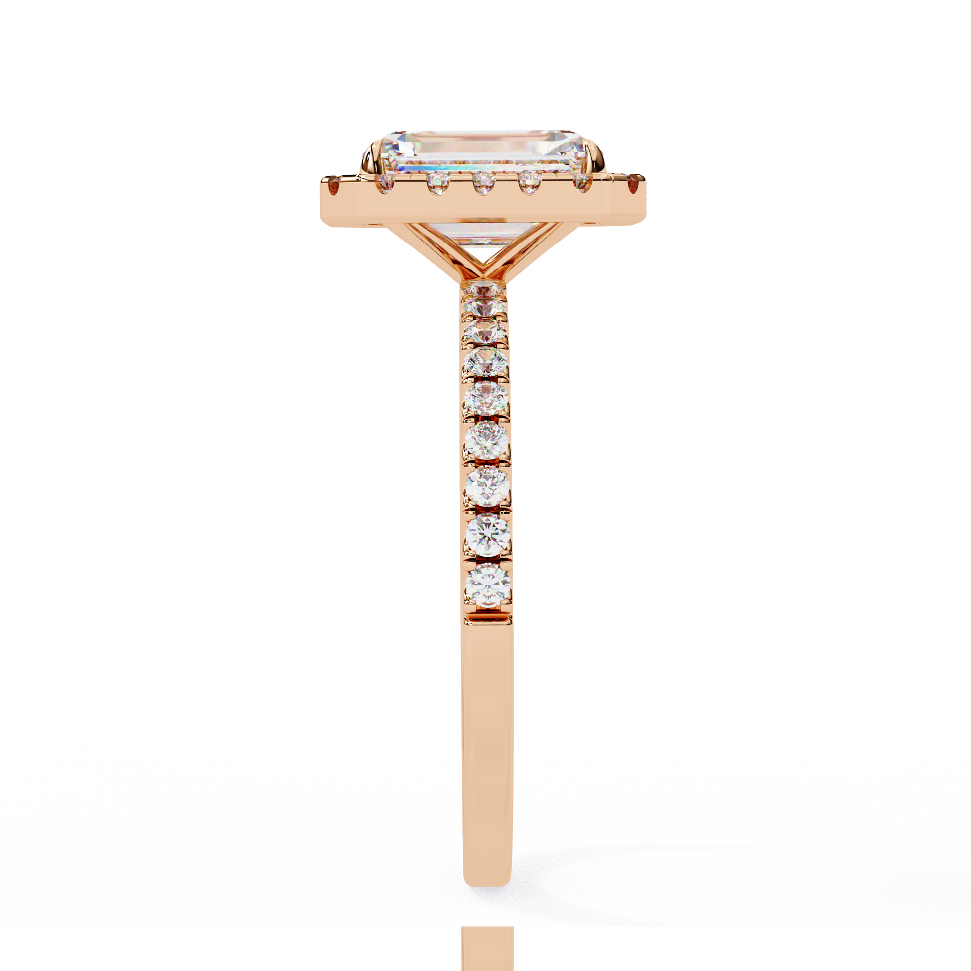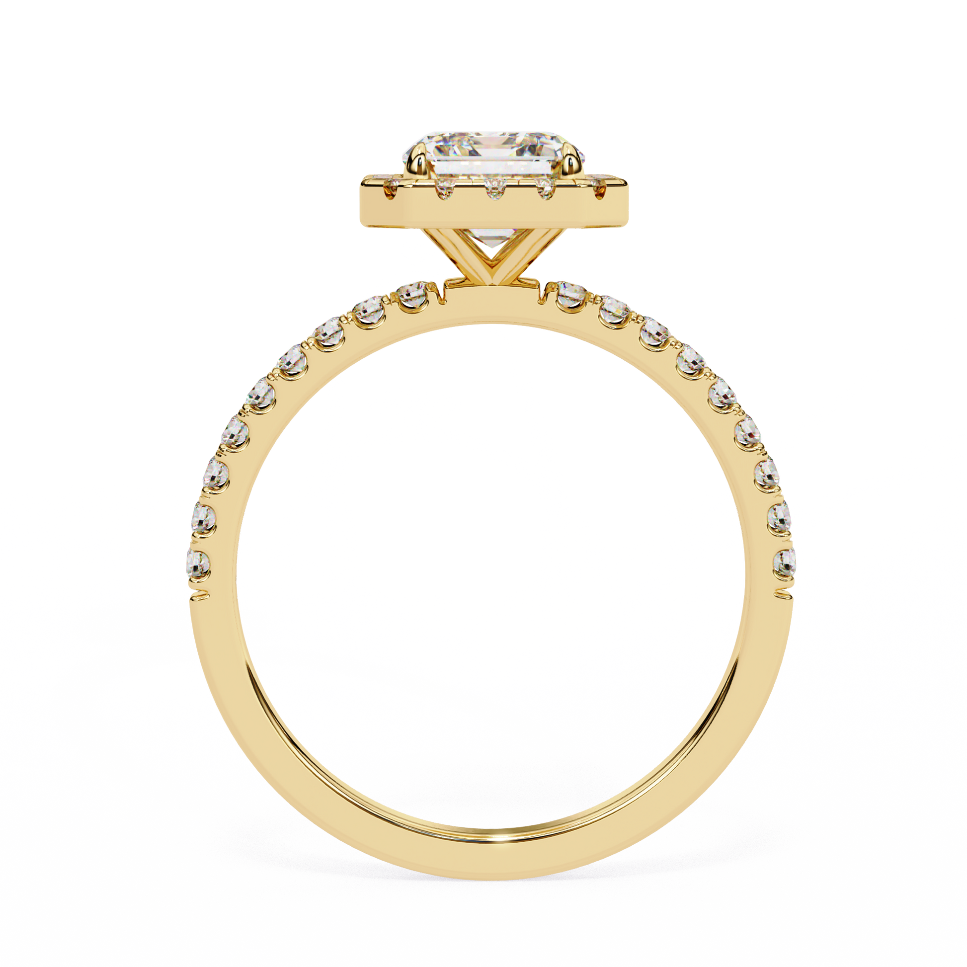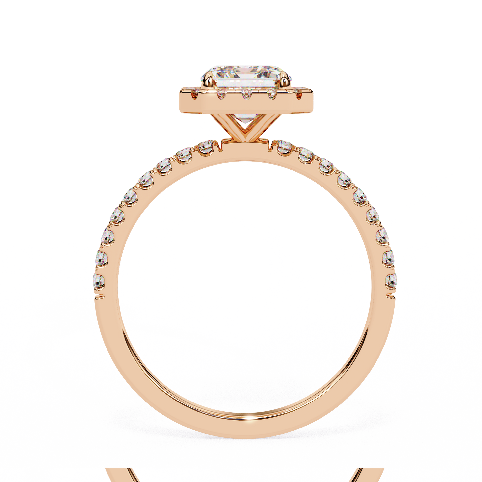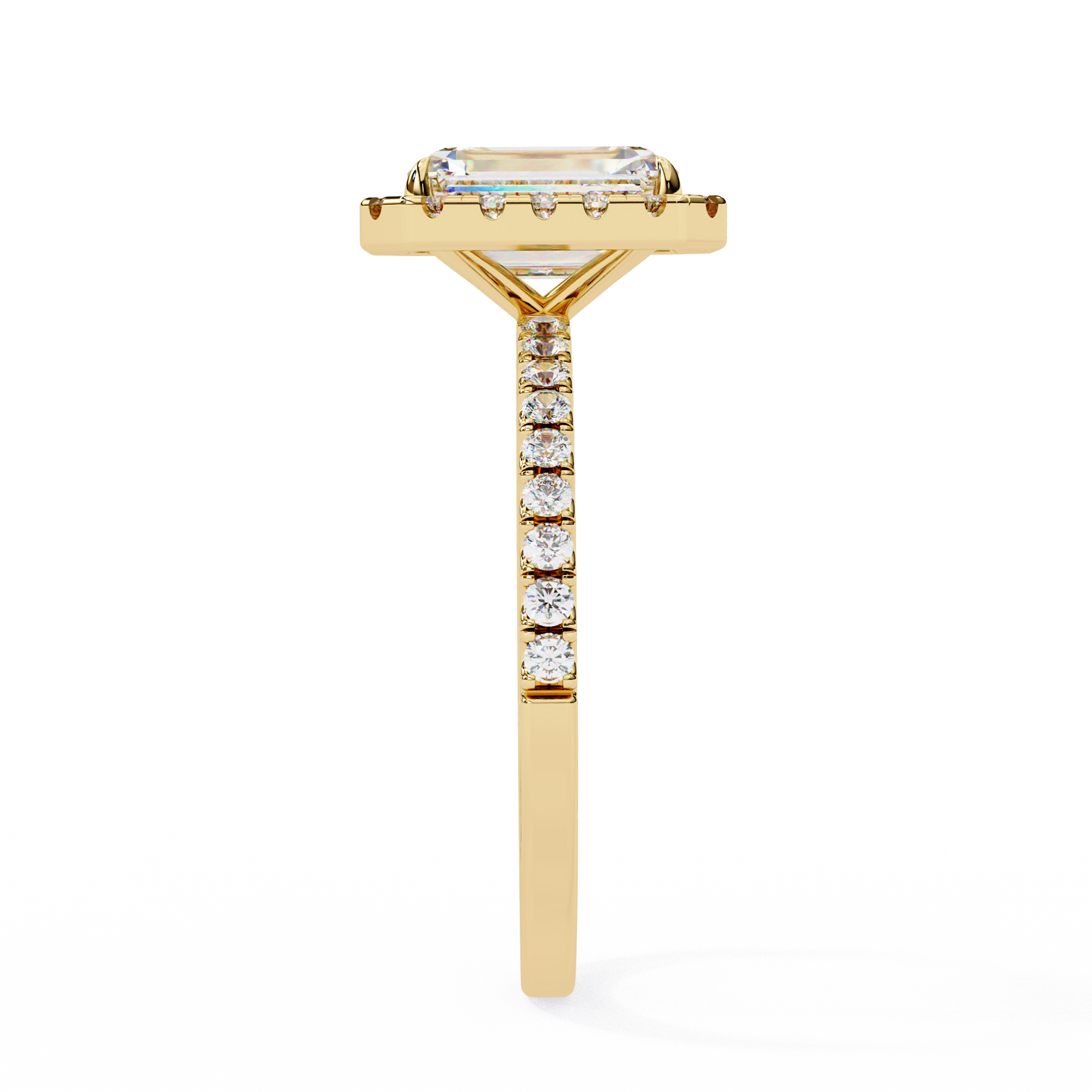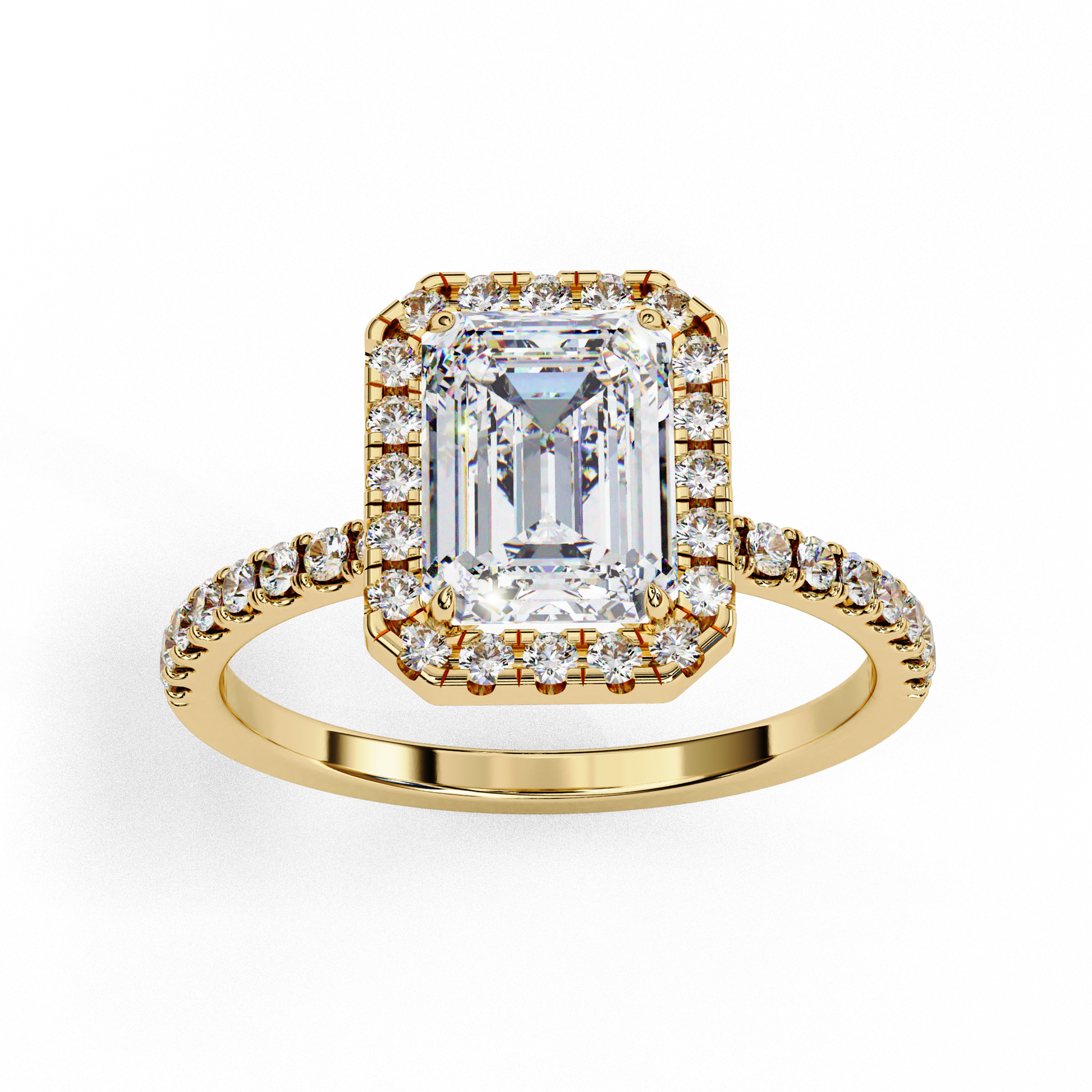 The Valentina ring showcases a stunning 1.84-carat Emerald-cut center stone, encircled by a halo of glittering diamonds. This exquisite design celebrates radiant love and timeless elegance, crafted to captivate hearts with its sophisticated beauty. With its impeccable craftsmanship and sparkling allure, the Valentina ring is a symbol of enduring romance, making it the perfect choice for those seeking a truly captivating piece of elegance and charm.